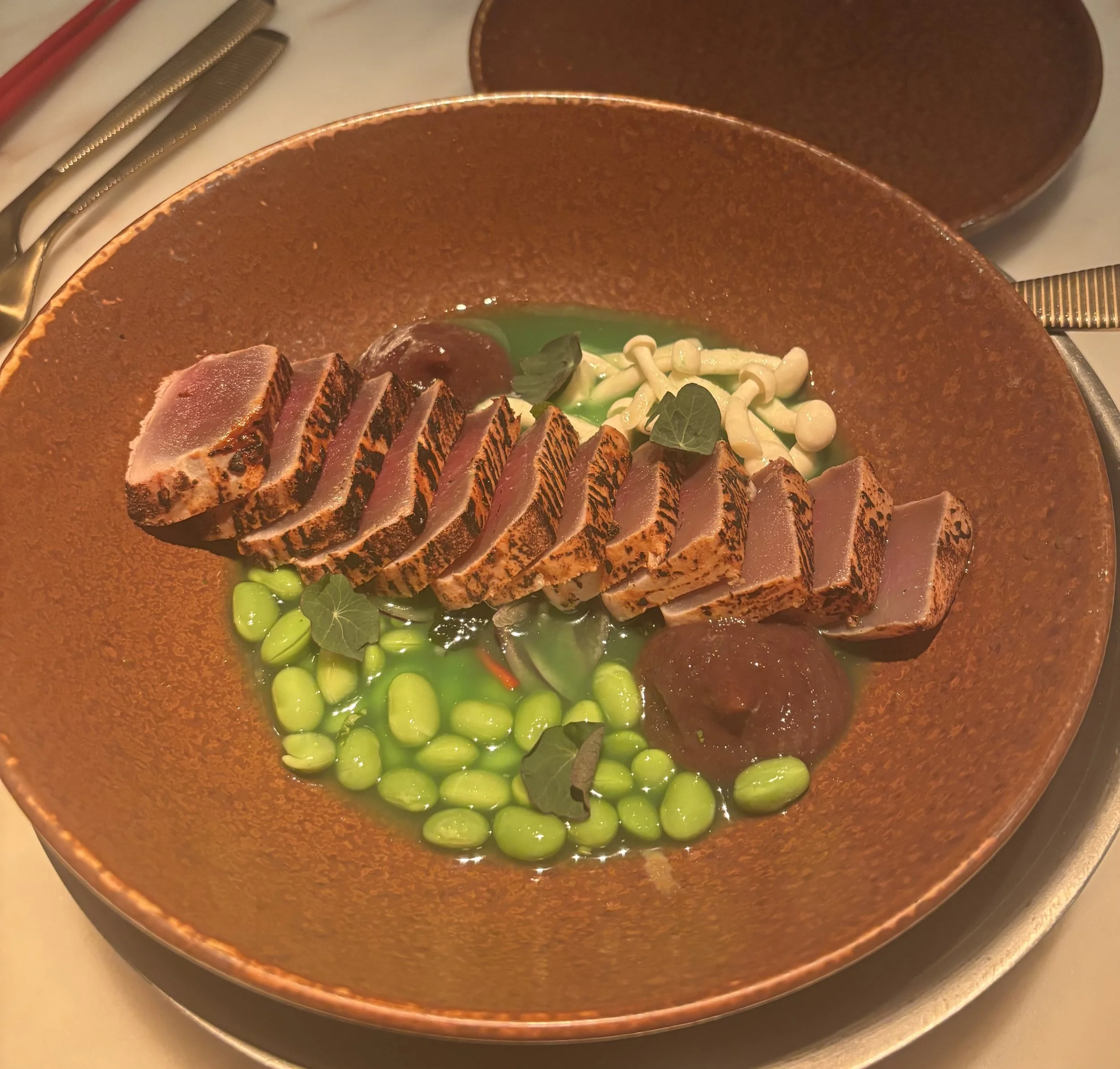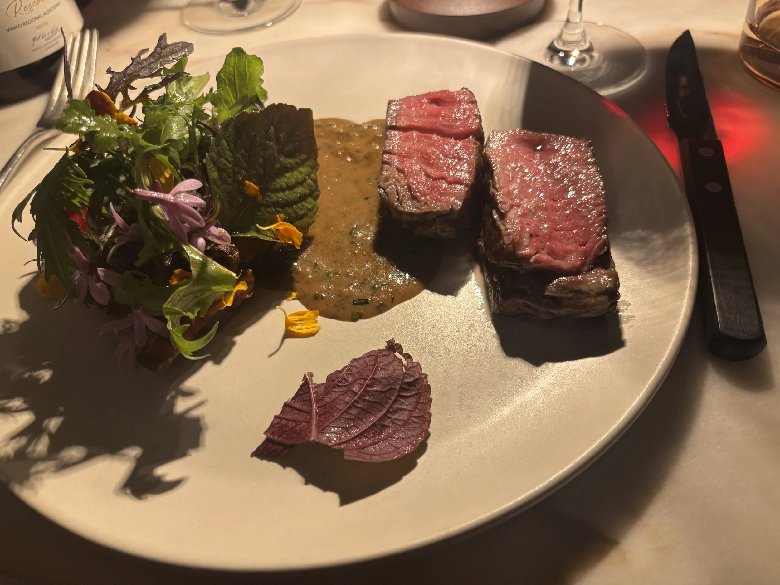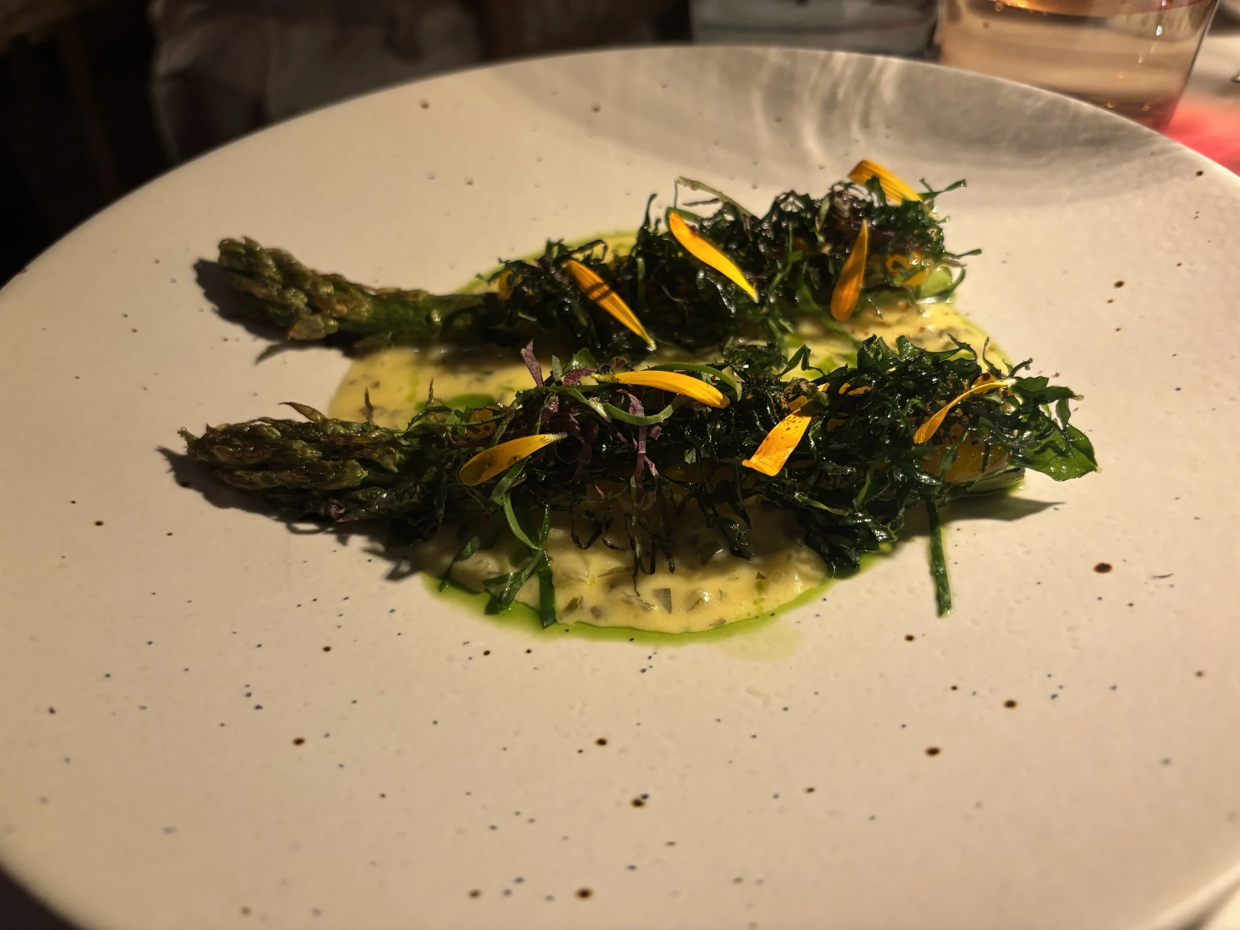 On our final evening, we dined at Santa Joana, the renowned restaurant by chef Nuno Mendes. Housed in a beautifully restored and spacious old convent, the setting was as impressive as the cuisine. The menu featured inventive fish, vegetarian, and meat dishes—like charred green asparagus with angel hair brassicas, a delicate 'dried' onion soup, and aged beef fillet with brandy and peppercorn sauce, served alongside caramelized Jerusalem artichokes. The wine list was outstanding, showcasing an elegant selection of Portuguese wines expertly recommended by the knowledgeable staff. The overall bill came to around €200 for 2.